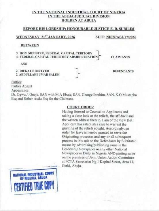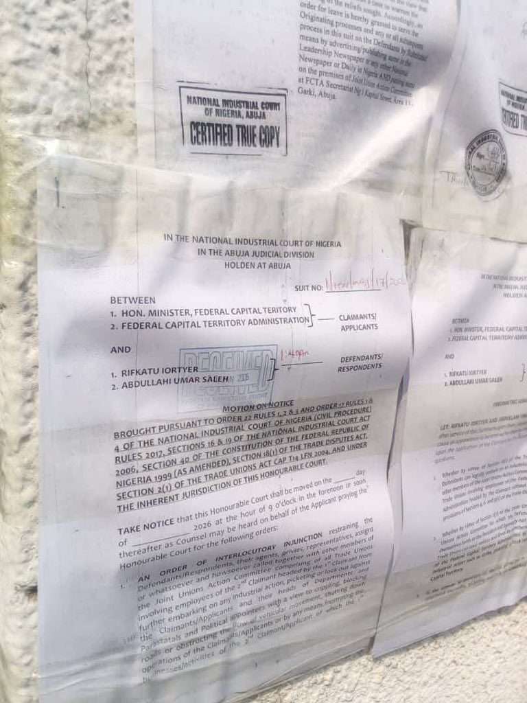 The suit, marked NICN/ABJ/17/2026, was filed by the Minister and the FCTA against the leadership of the Joint Unions Action Committee (JUAC). It seeks to restrain the unions from continued picketing, blocking access to government buildings, and disrupting the official duties of political appointees and department heads.