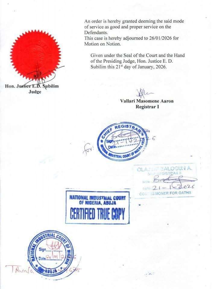In a significant procedural development, Honourable Justice E. D. Subilim of the National Industrial Court has granted the Minister’s application for substituted service. Due to the absence of the union leaders during initial court proceedings, the judge authorised that all legal documents be served via: