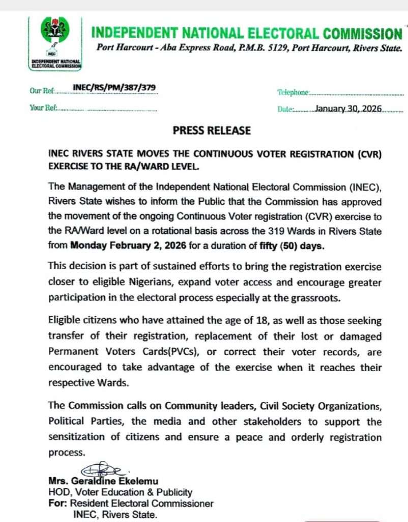 Eligible residents of Rivers State are encouraged to monitor the rotational schedule to identify when the INEC registration team will be present in their specific Ward.