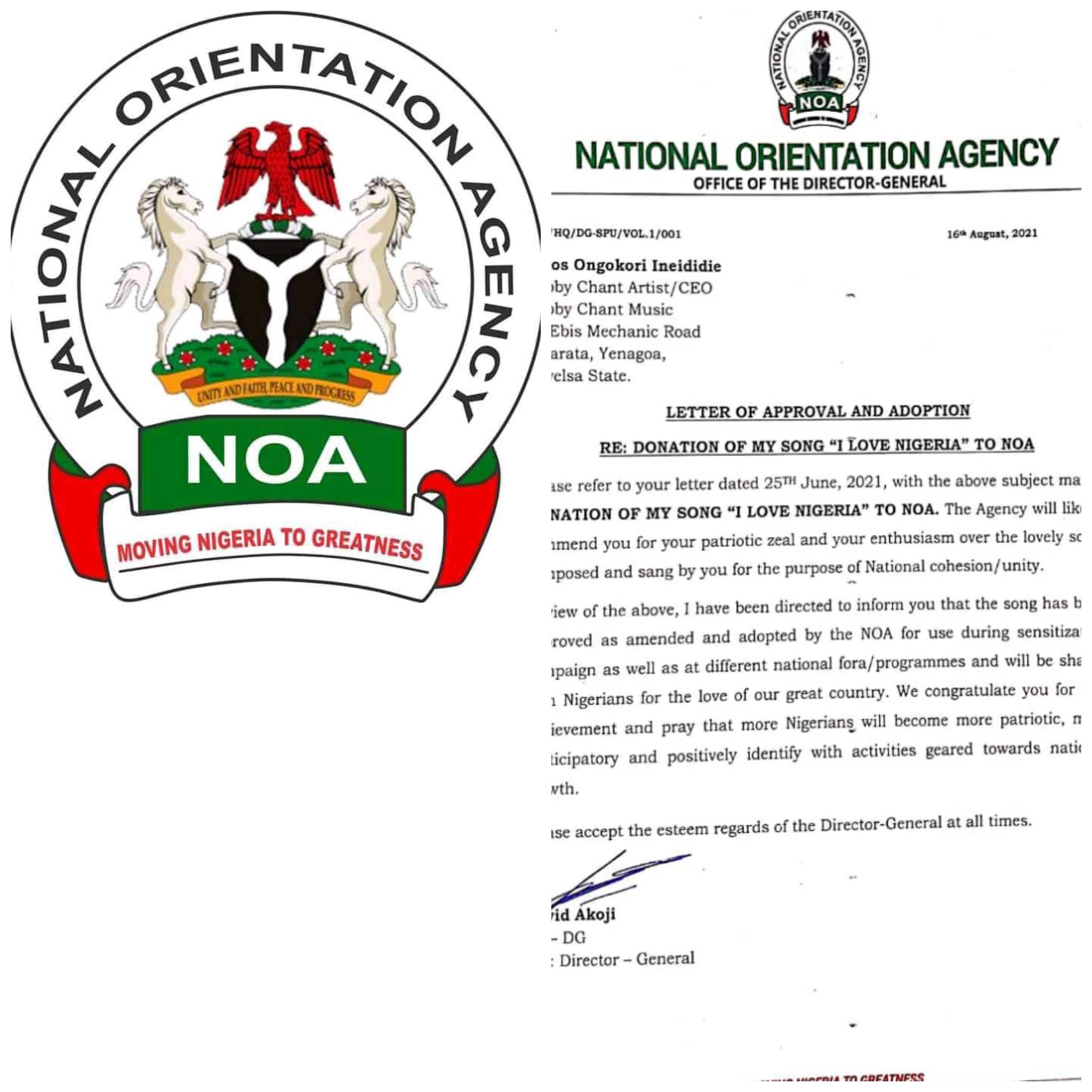 “I’ve been directed to inform you that the song “I LOVE NIGERIA” has been approved as amended and adopted by NOA for use during sensitization campaigns and as well as different fora/programs and will be shared with Nigerians for the love of our great country.”